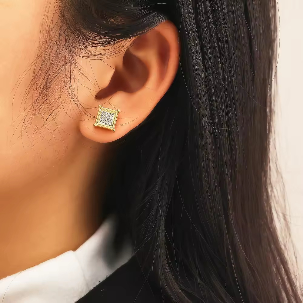 This Lonceen stainless steel ear jewelry features gold-plated stainless steel square studs inlaid with dense crystals—blending structured geometric shape and bright sparkle, tailored for upscale styling.