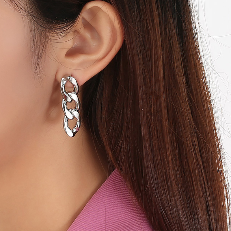 These fashionable earrings feature a trendy thick chain pendant design, crafted from high-quality non-oxidizing stainless steel with 18K gold plating. The thick chain structure exudes a strong sense of texture and modern fashion, while the carefully designed pendant adds a touch of elegance and uniqueness, making the earrings both bold and delicate. With excellent non-oxidizing performance and high-standard 18K gold plating technology, the earrings can resist the erosion of air and moisture, maintaining a bright and uniform golden luster for a long time without fading or discoloration. Suitable for daily commuting, dating, parties, urban leisure and other occasions, they can perfectly match various styles of clothing, catering to the fashion needs of modern women who pursue personality and texture.