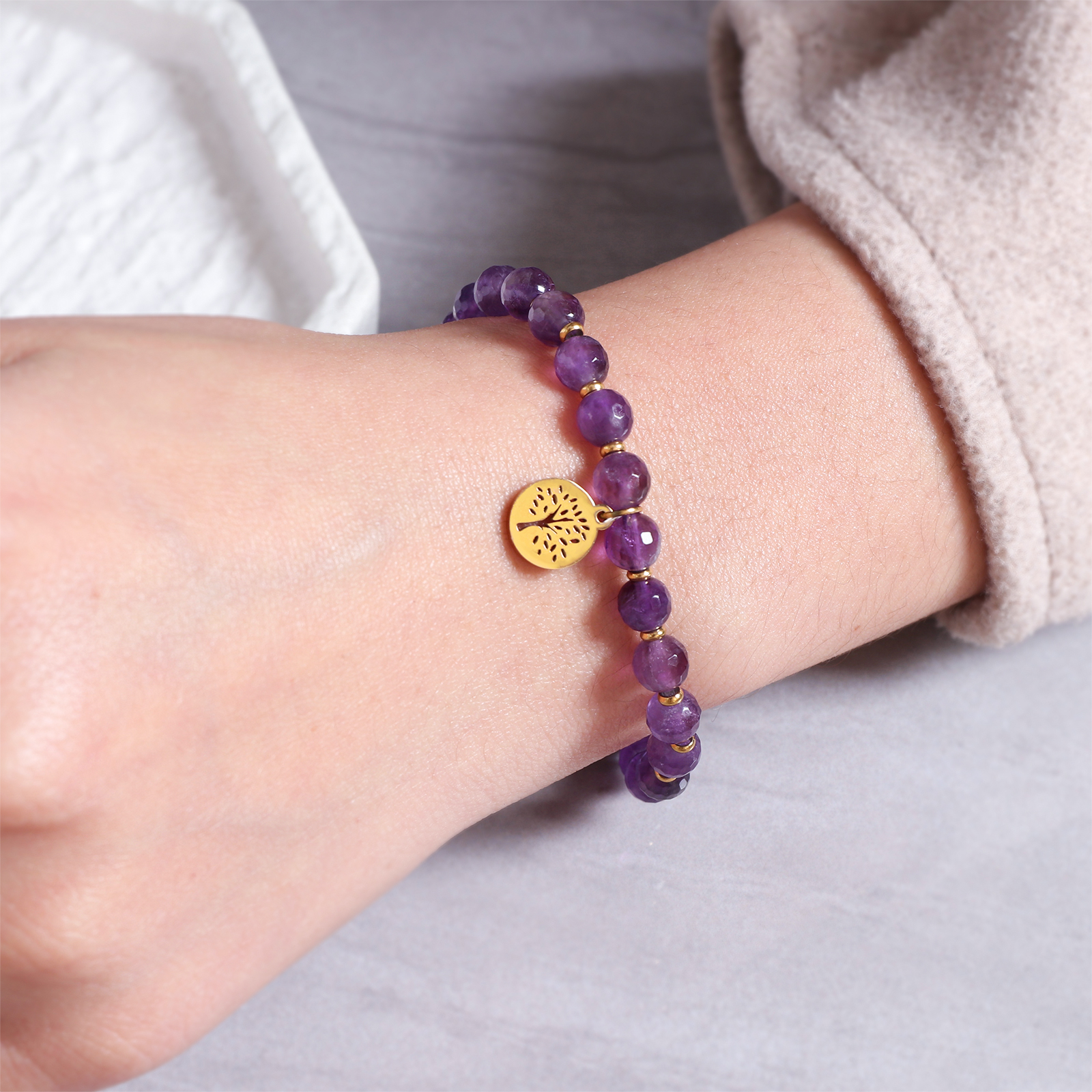 The stainless steel amethyst bracelet is suitable for daily wear and gift collections, matching both casual and elegant styles.