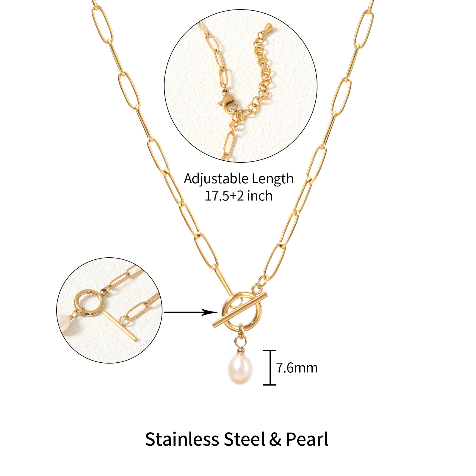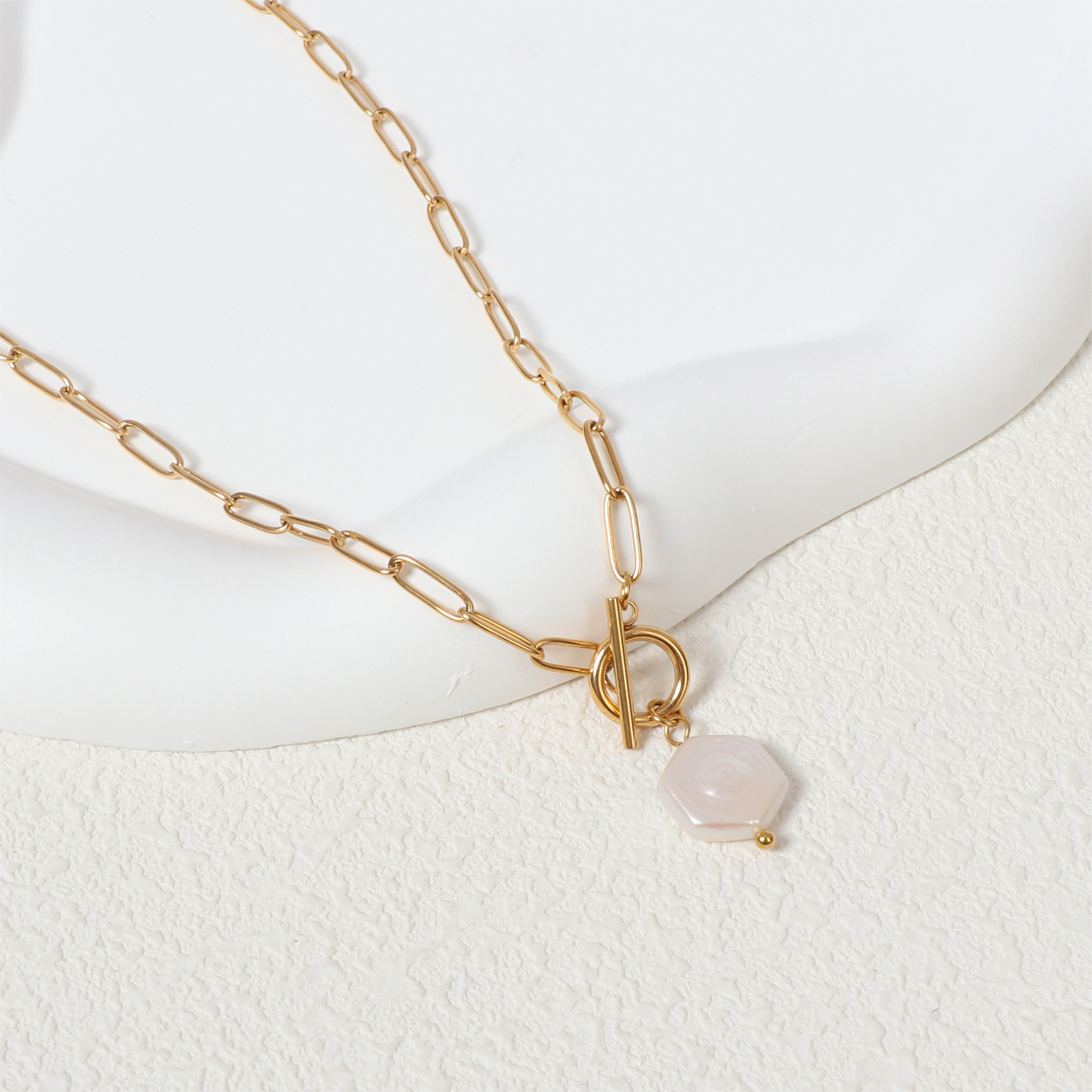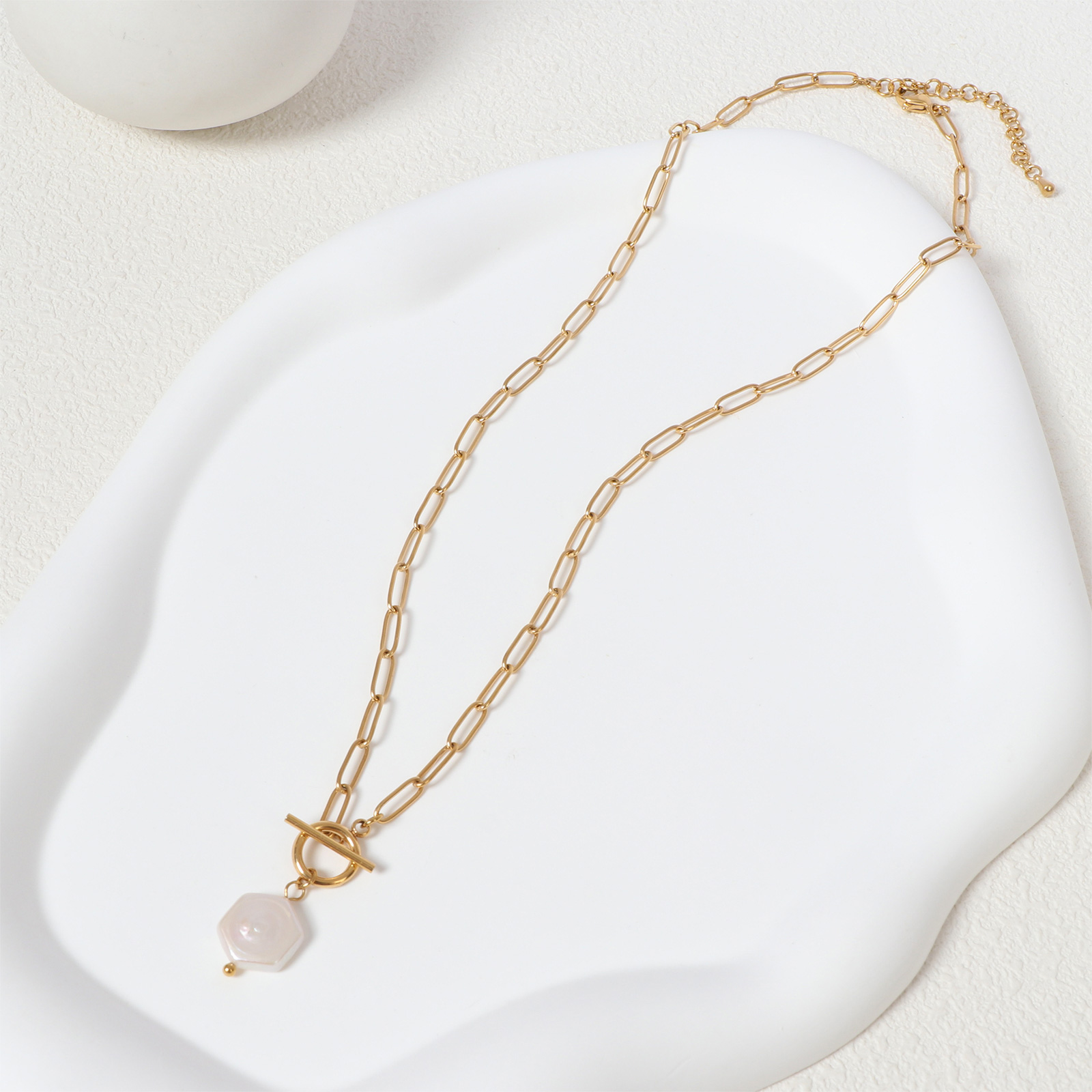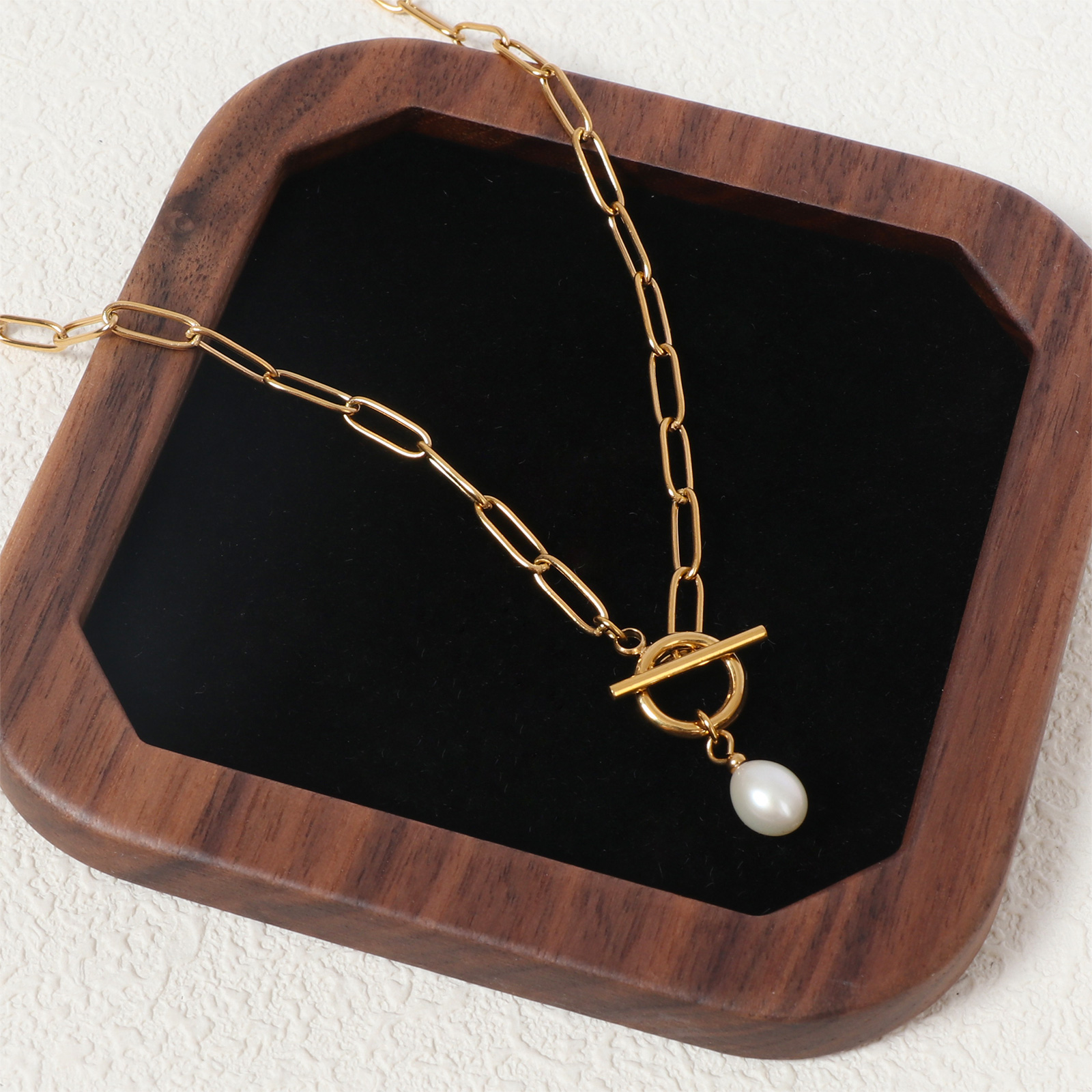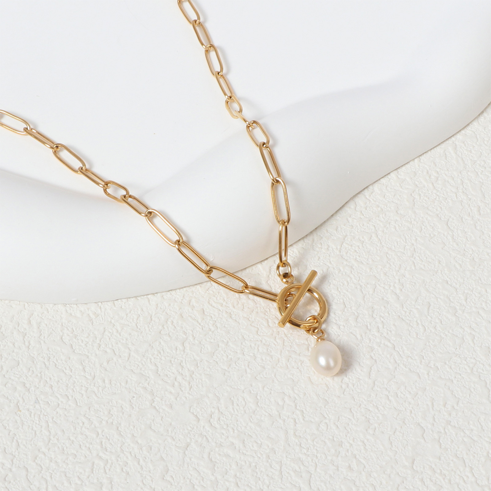 The baroque pearl pendant features a unique geometric shape with natural luster. Each pearl offers individual character, enhancing the visual appeal of the stainless steel necklace.