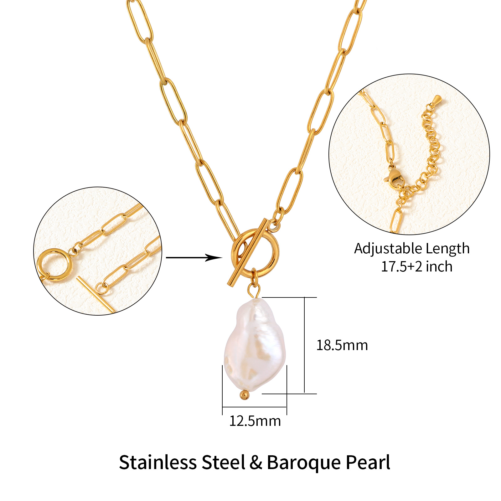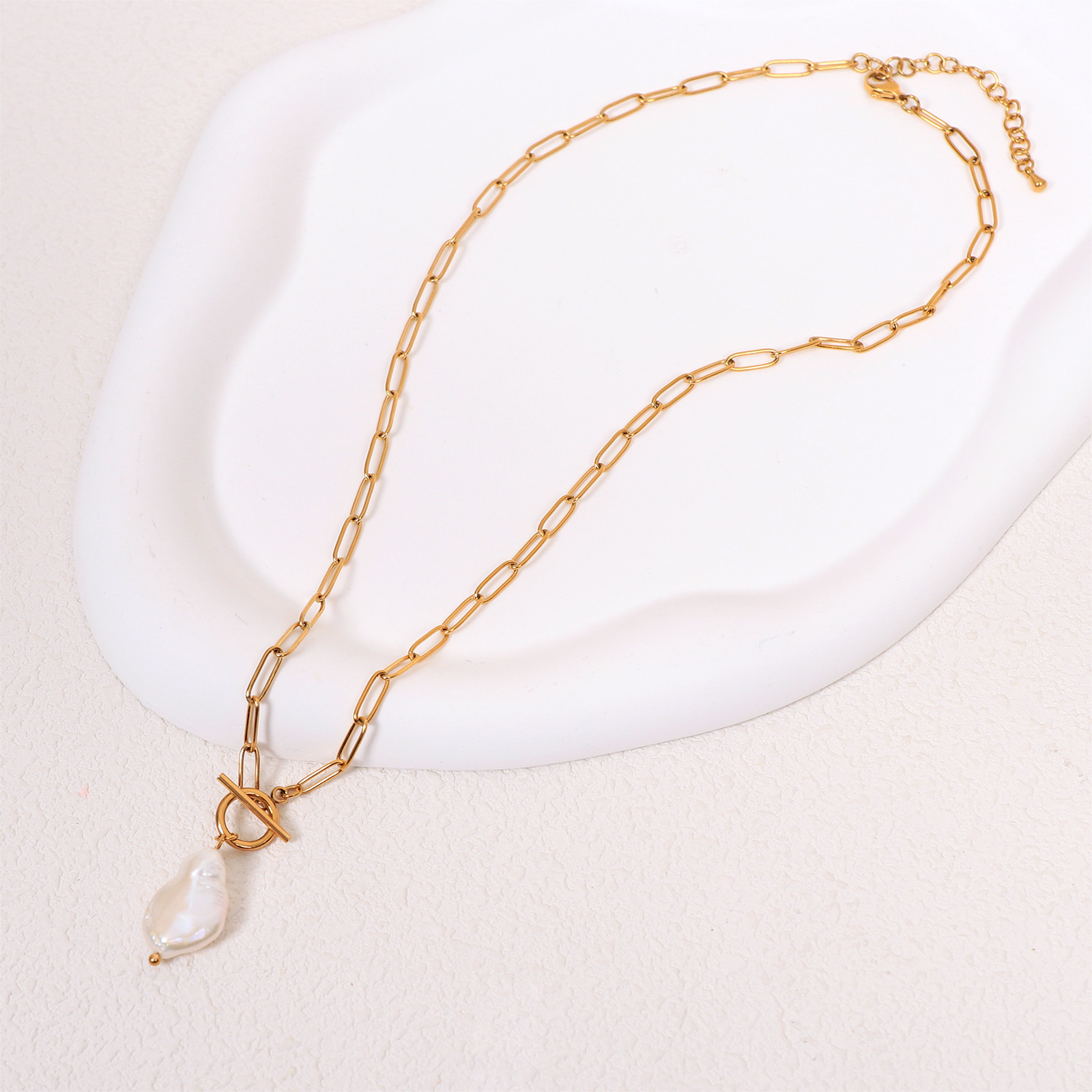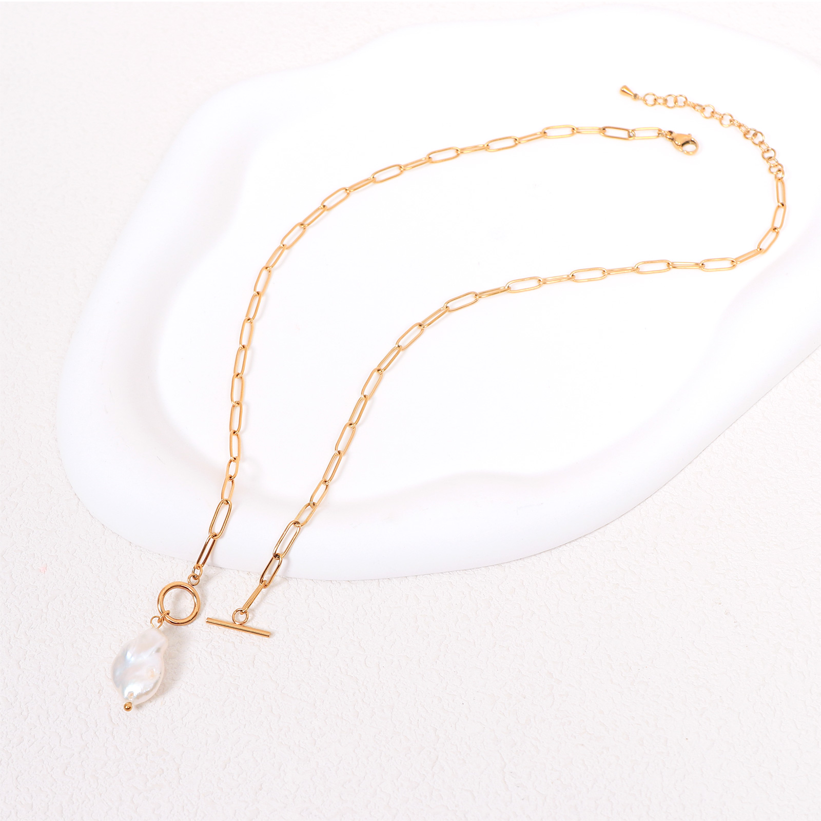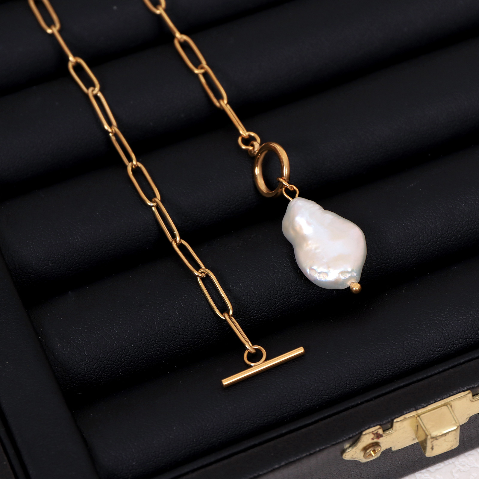 The baroque pearl pendant showcases a naturally irregular shape and soft luster. Each pearl is unique, enhancing the character and value of the stainless steel necklace.