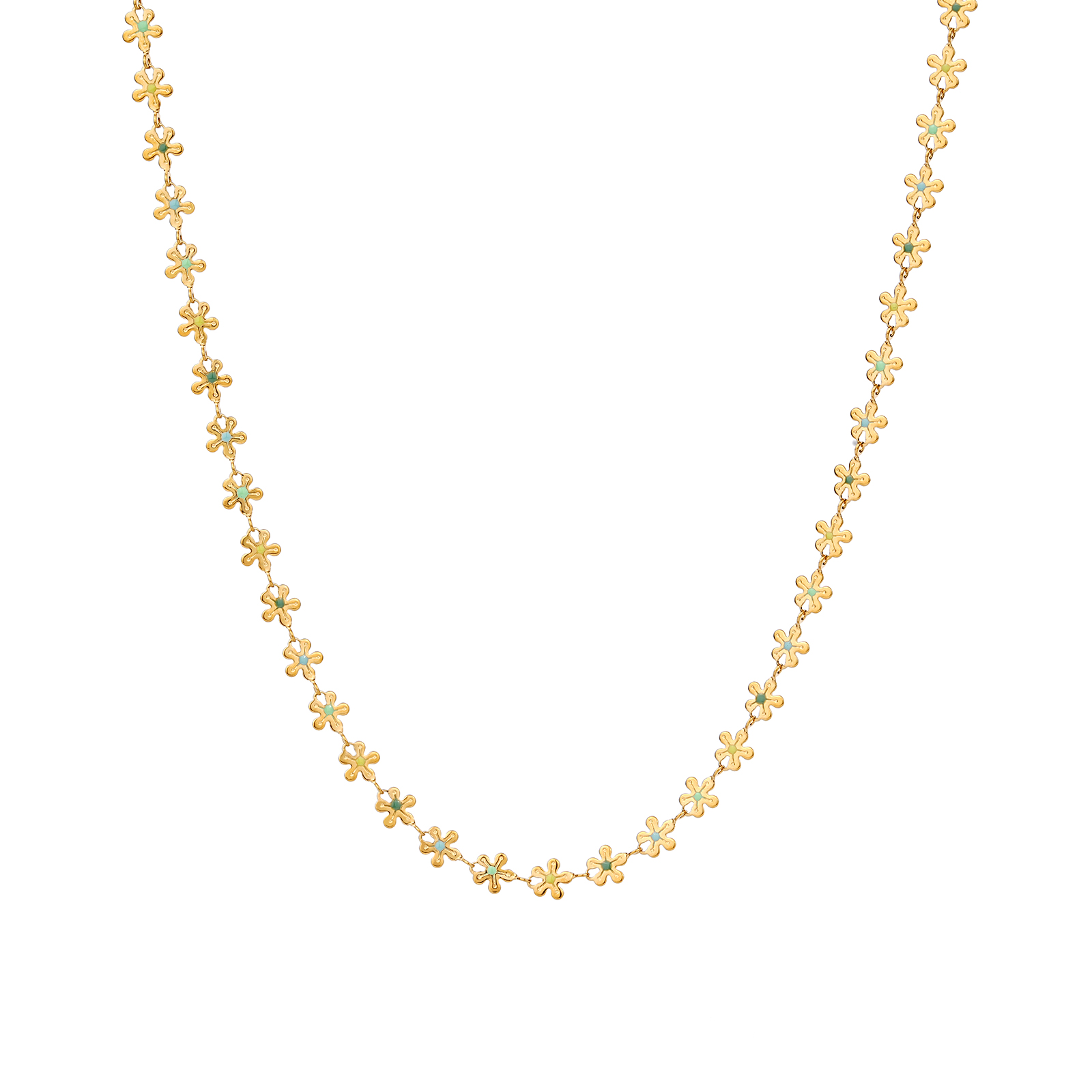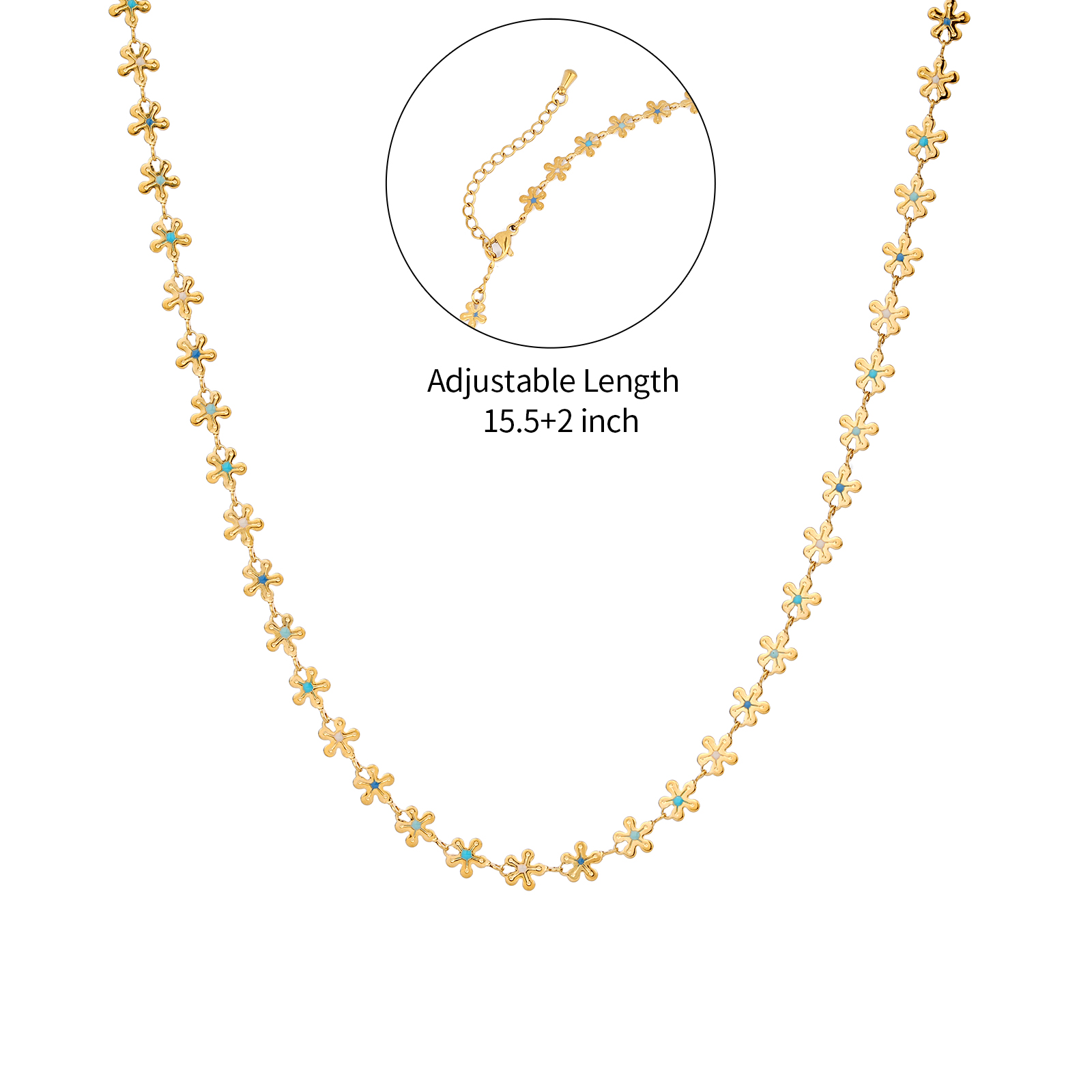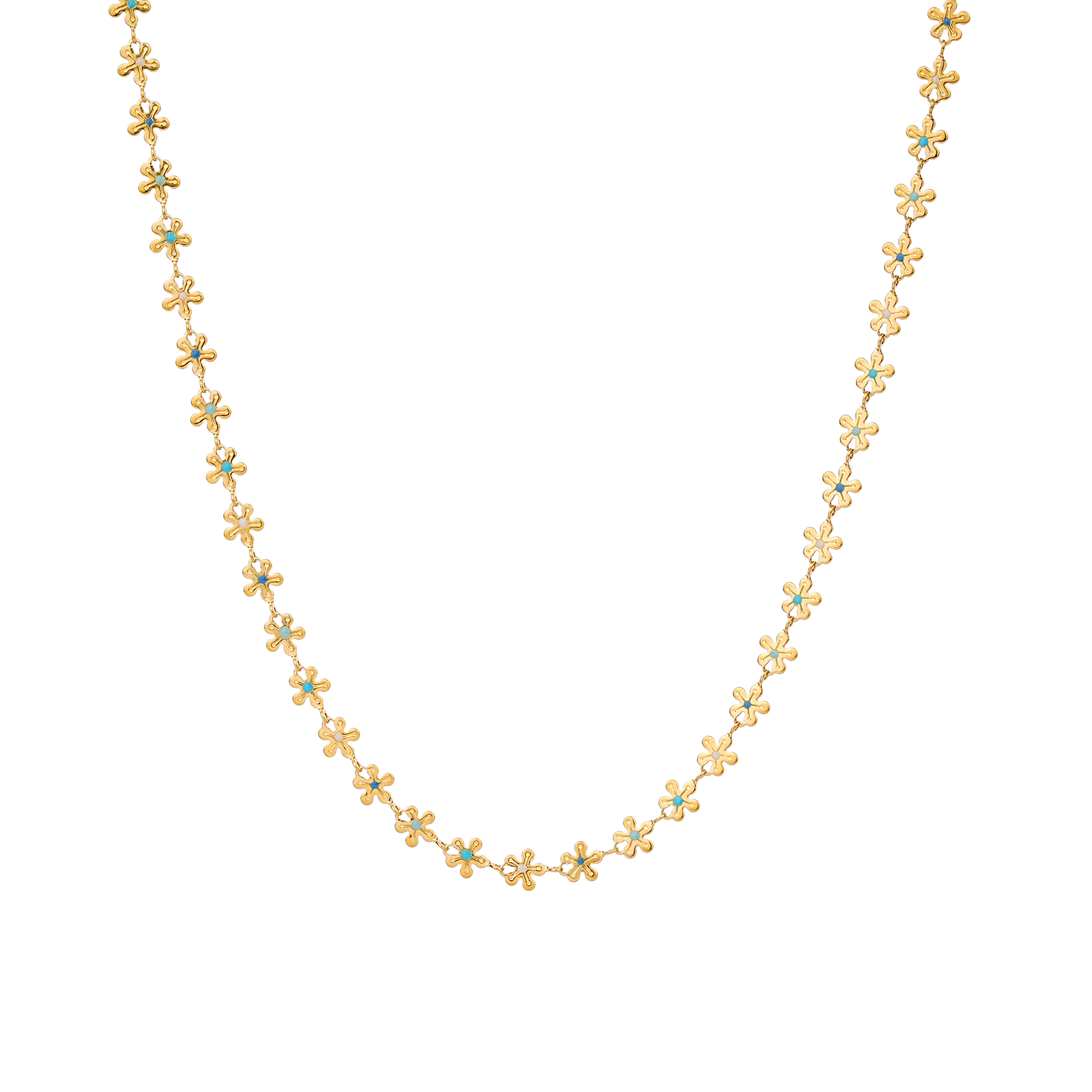 The necklace features a continuous flower chain design with white, deep blue, blue green, and light blue color details, creating a fresh and elegant stainless steel necklace style.