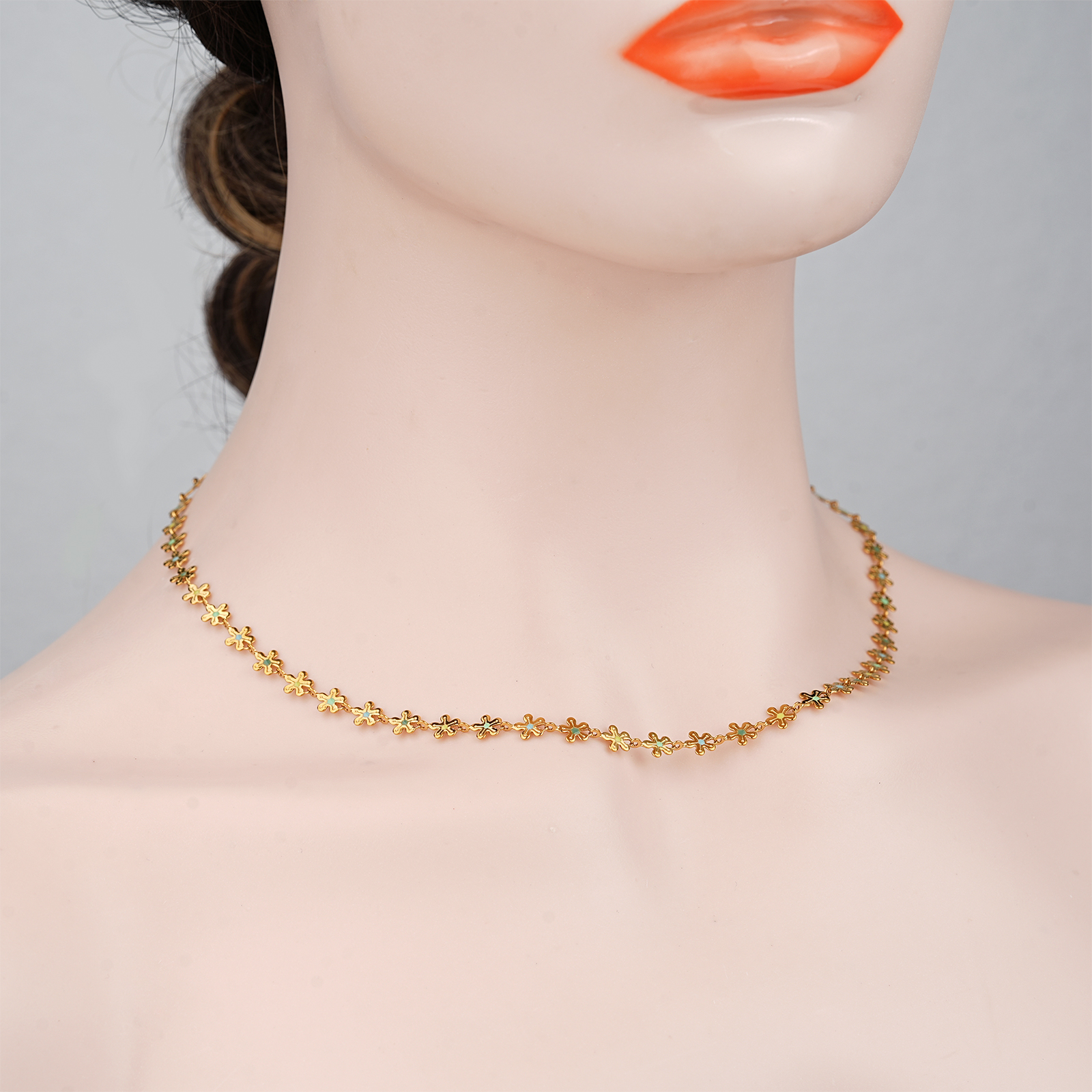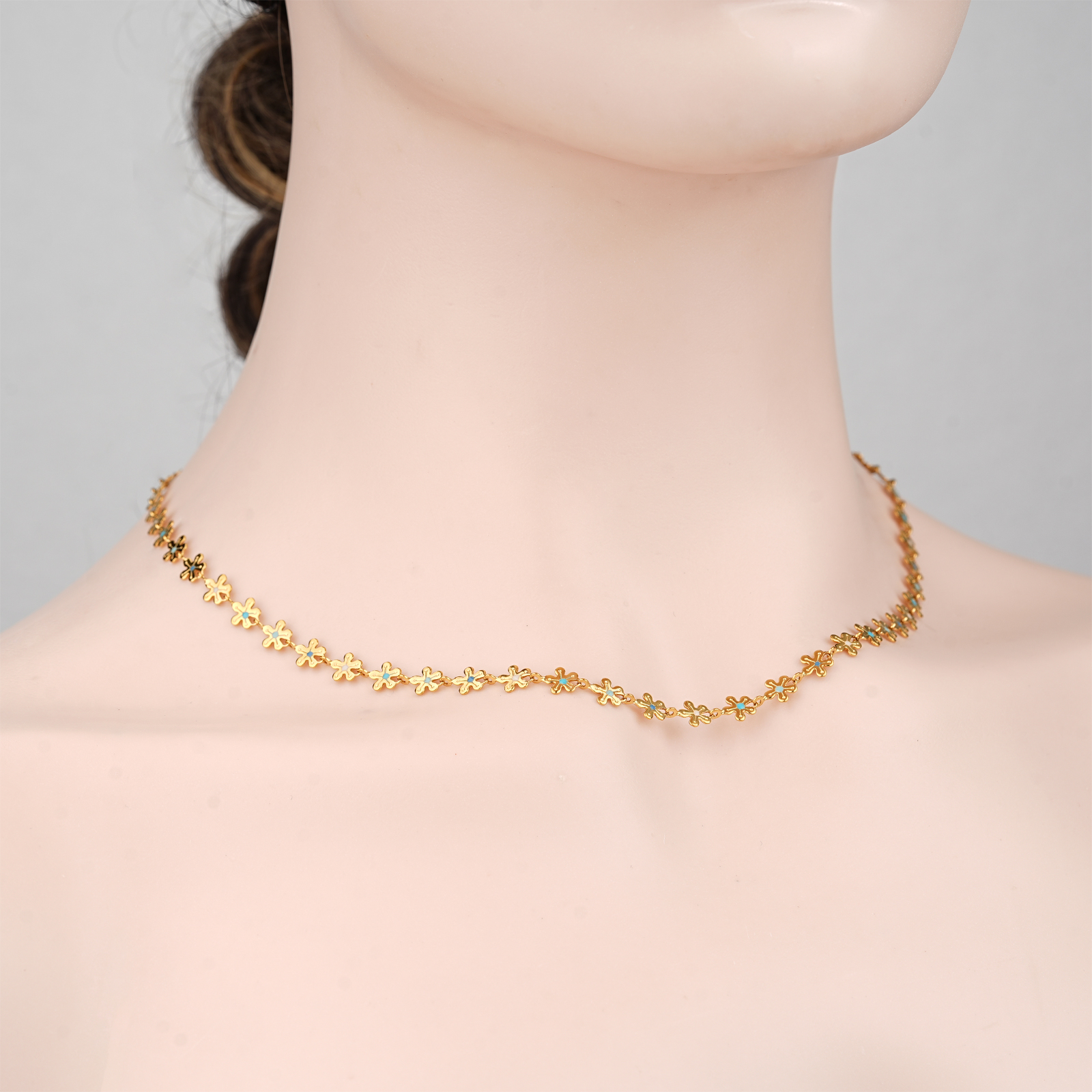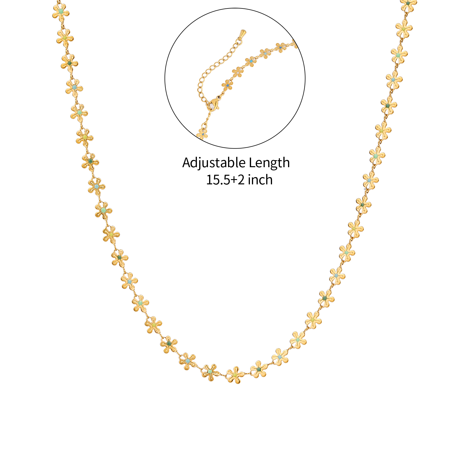 The necklace features a continuous flower chain design with white, deep blue, blue green, and light blue color details, creating a fresh and elegant stainless steel necklace style.
