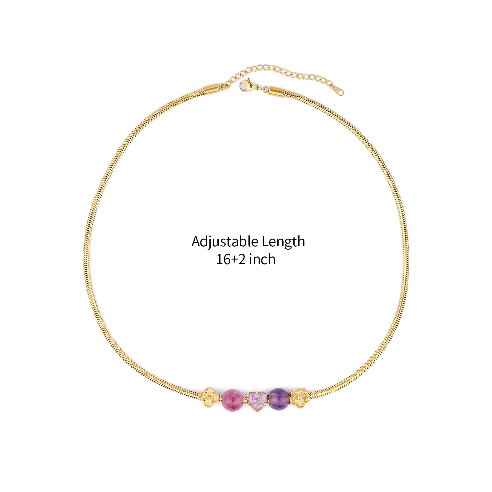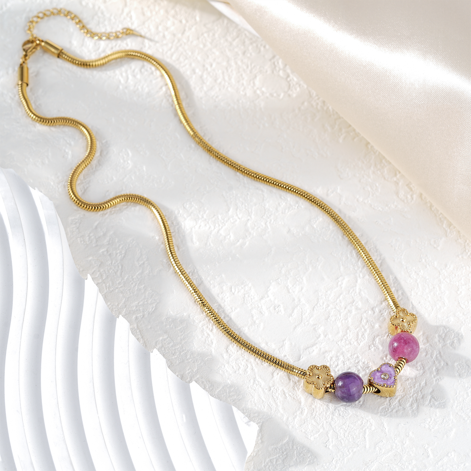 The necklace is designed with refined amethyst bead accents, adding a subtle color contrast while maintaining a minimalist stainless steel necklace style.