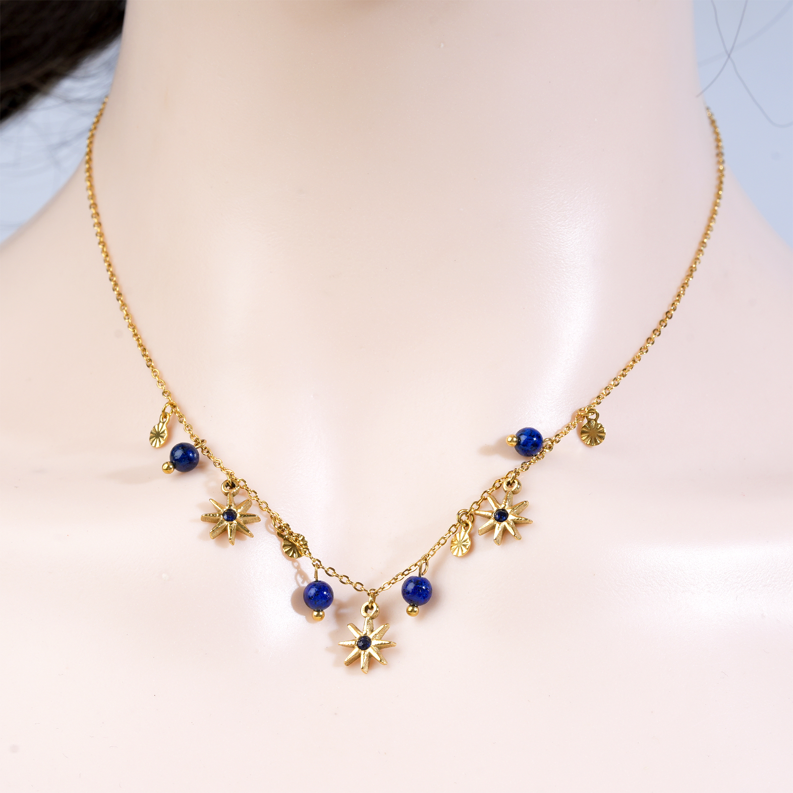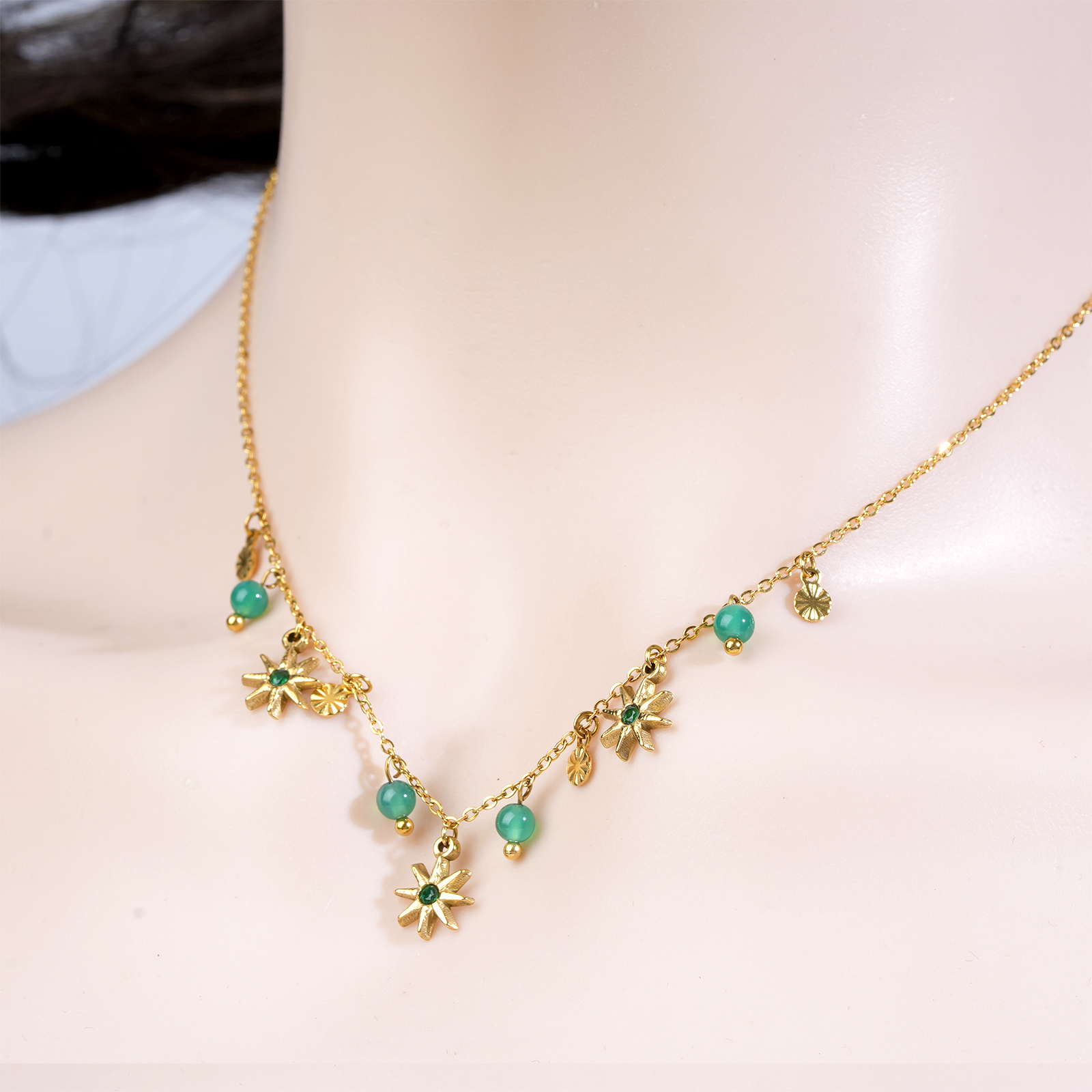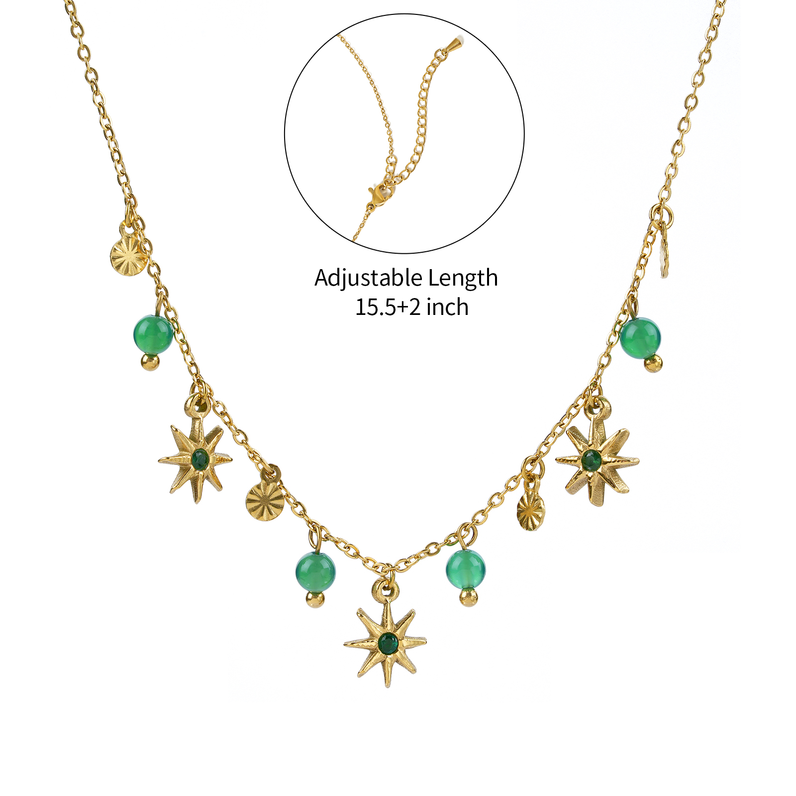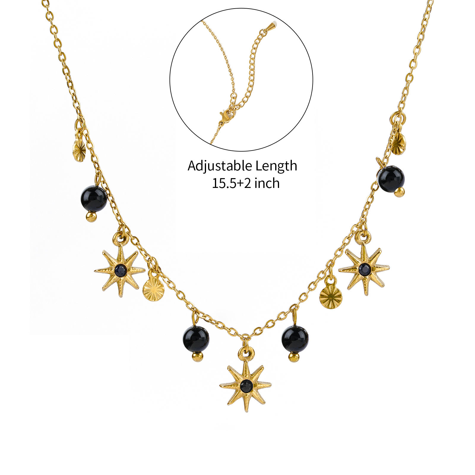 Featuring black agate bead charms combined with star shaped pendants, this stainless steel necklace delivers a bold yet elegant visual style.