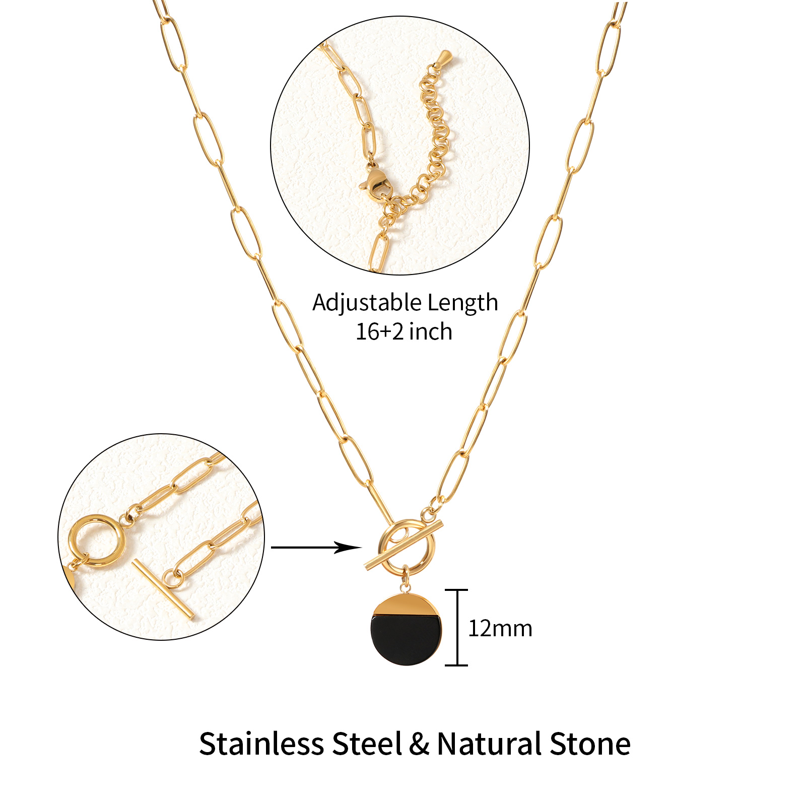 The black agate pendant adds a bold and modern contrast to the metal chain, creating a balanced look suitable for minimalist and unisex jewelry styles.