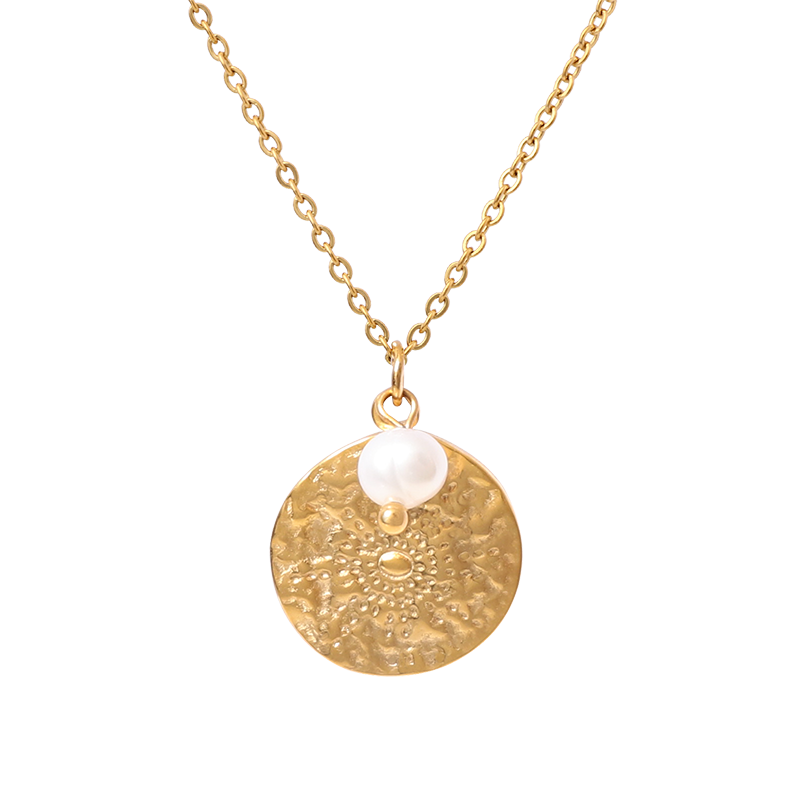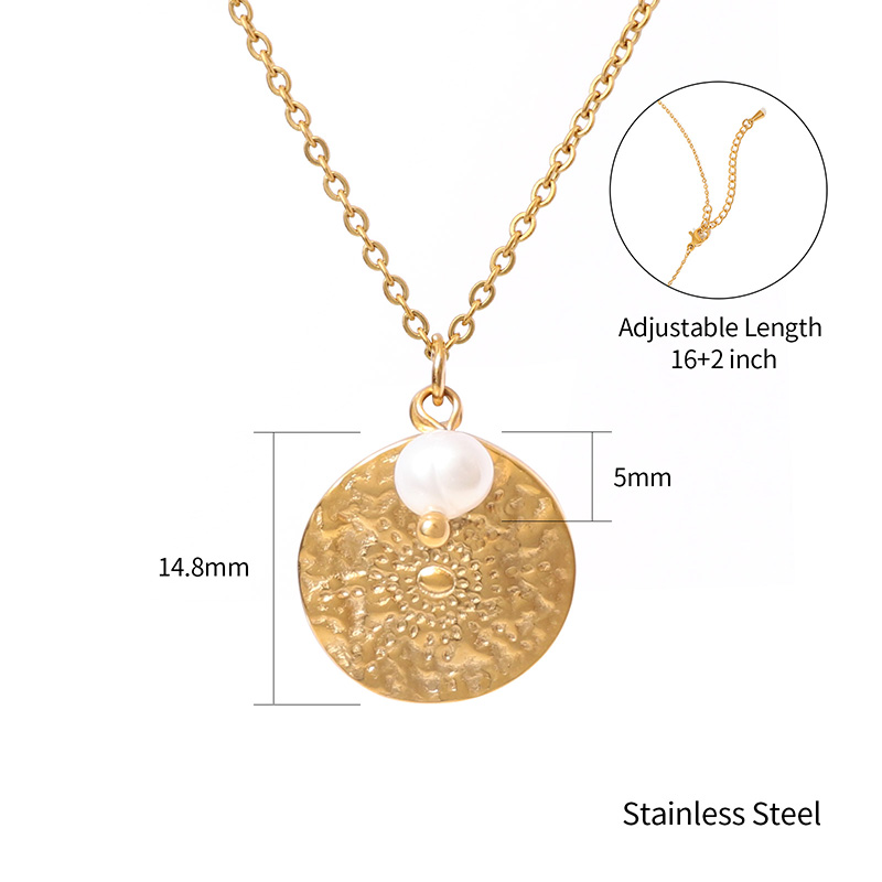The freshwater pearl adds a natural and refined touch to the stainless steel necklace creating a balanced look between modern strength and classic elegance suitable for multiple markets.