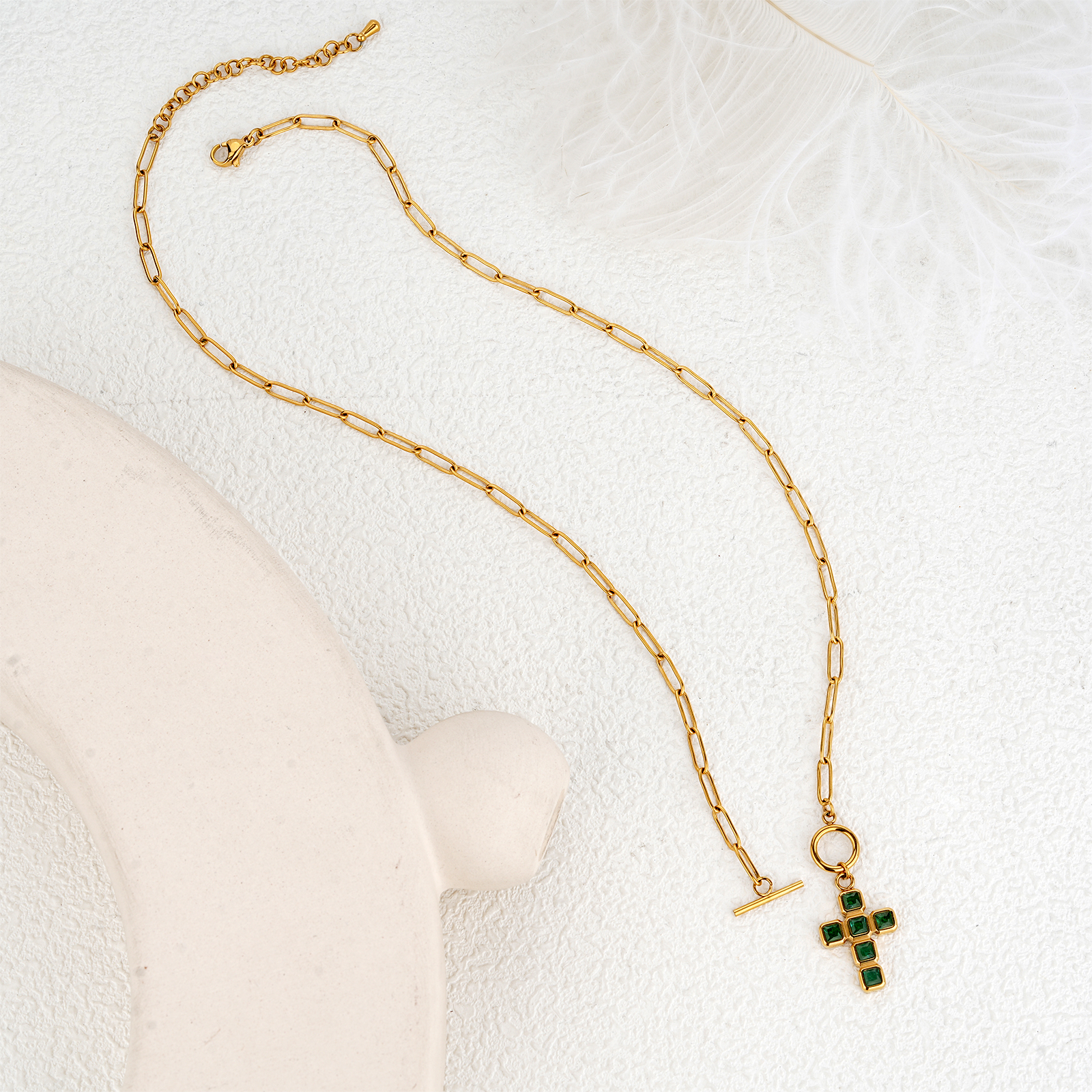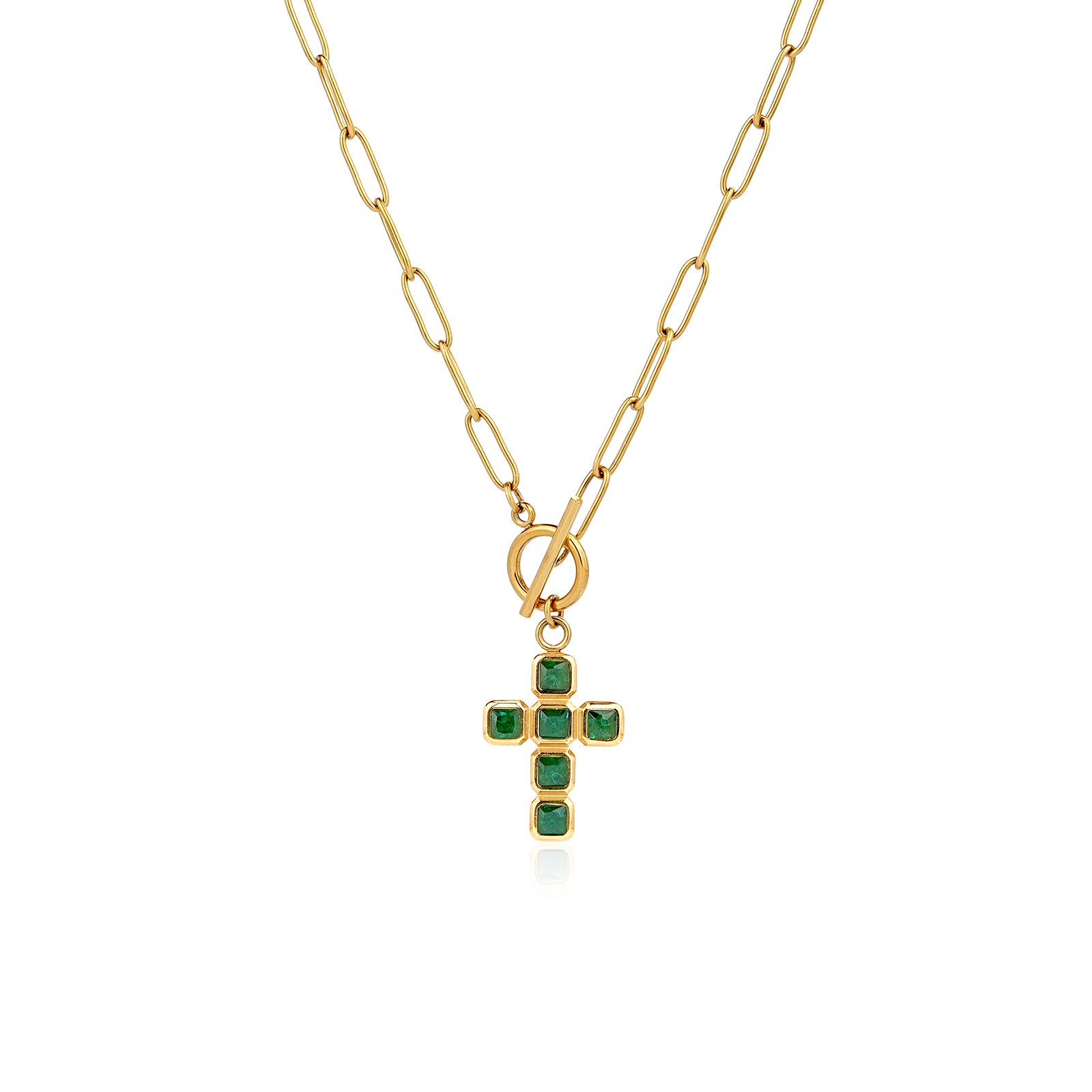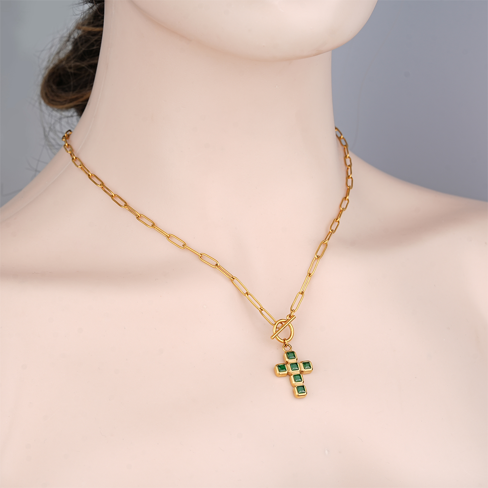The stainless steel necklace with green nano cross pendant is ideal for fashion brands, gift collections, and religious jewelry assortments.