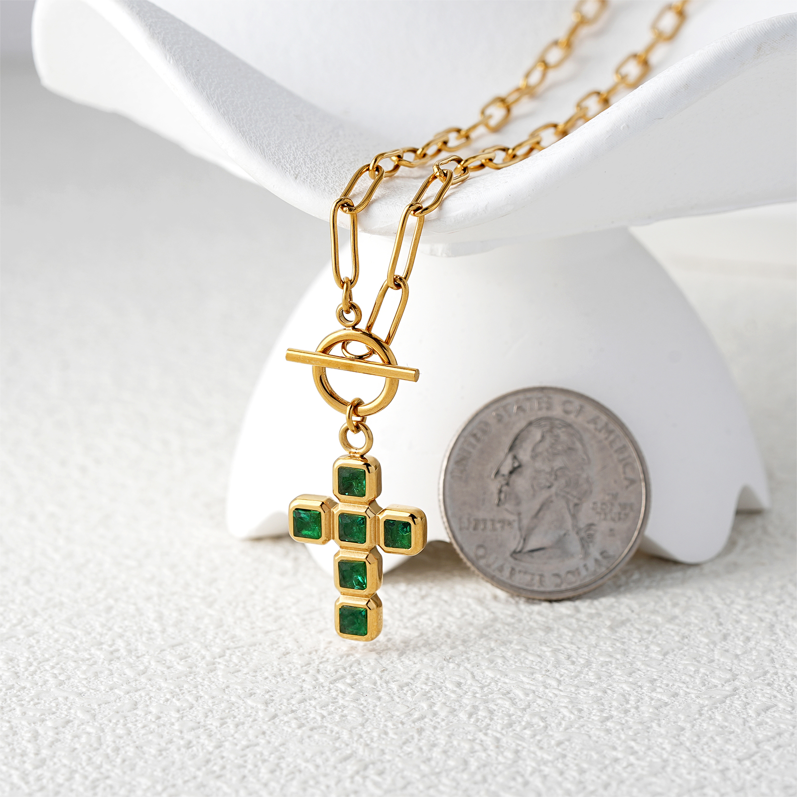 The green nano cross pendant combines religious symbolism with modern fashion elements, making it suitable for faith inspired jewelry collections and daily wear.