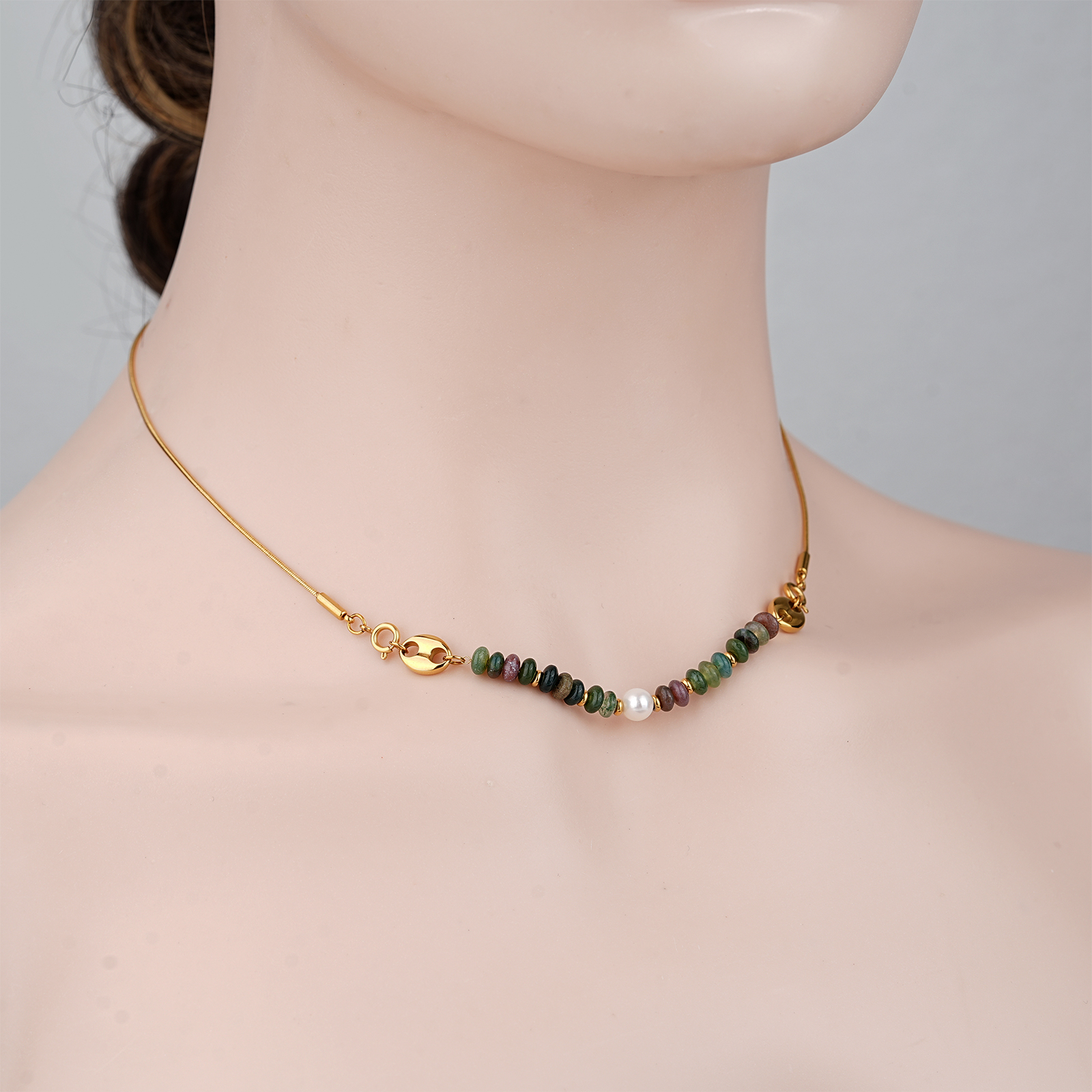 The necklace features carefully selected Indian agate beads, known for their rich natural colors and unique patterns, paired with a pearl for added elegance.
