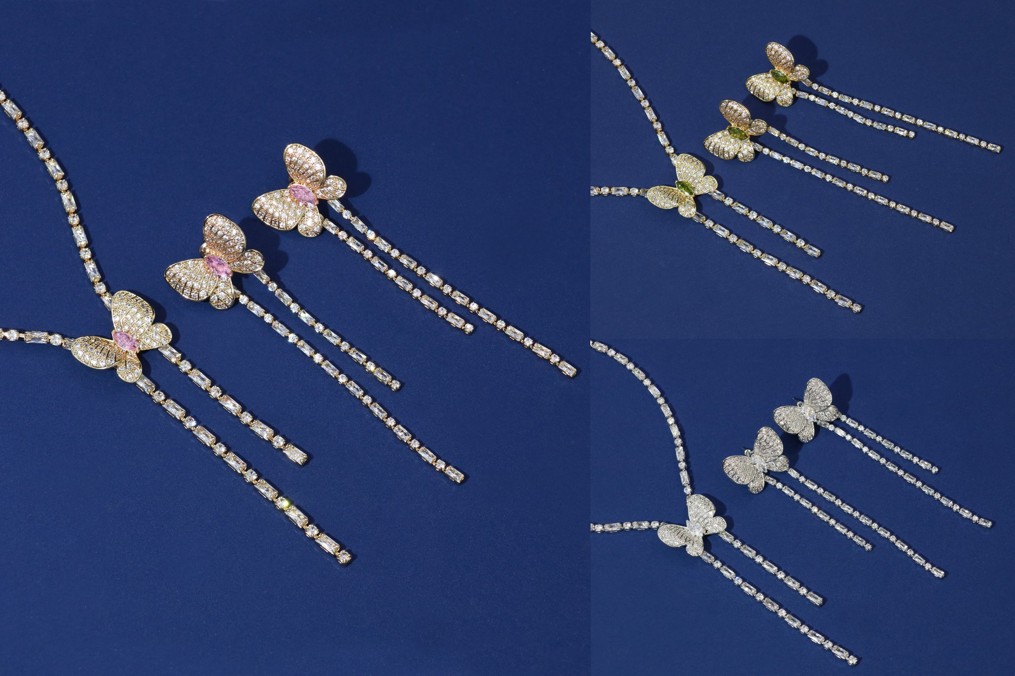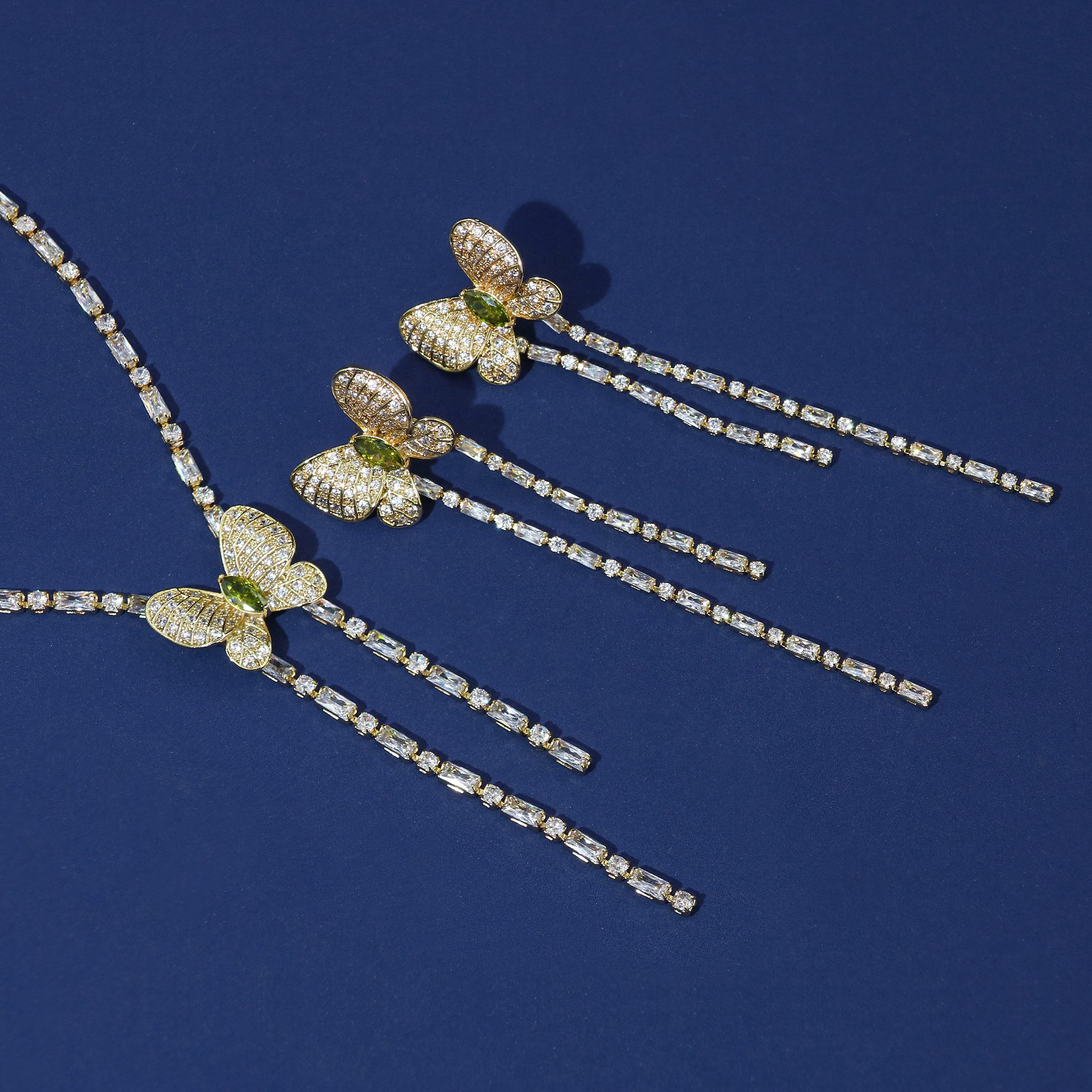 The 18k Gold Plated Copper Butterfly Zircon Long Chain Jewelry Set multi color for prom and evening gown matching adds refined sparkle and graceful movement to formal looks.