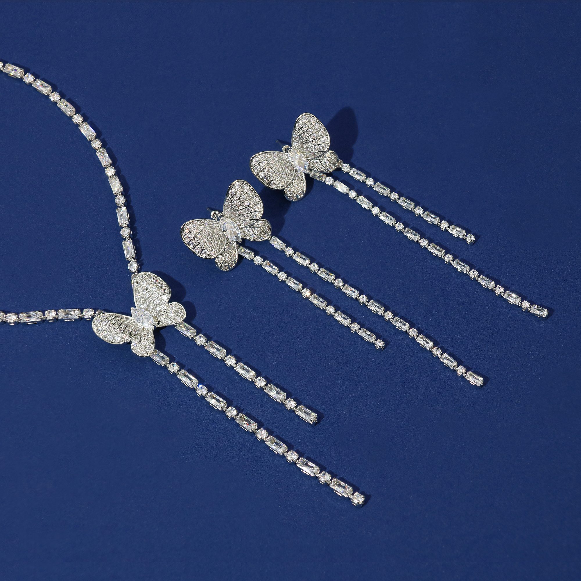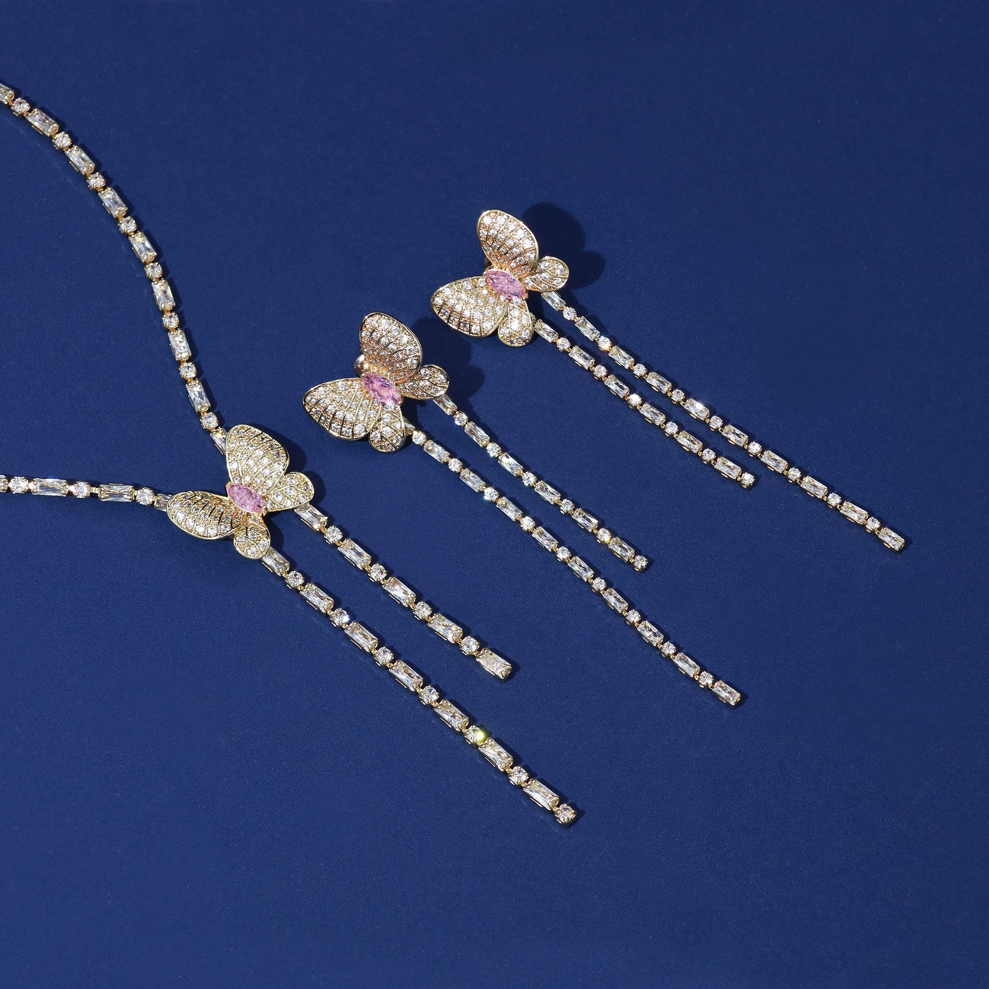 This wedding jewelry set for brides features a Multi Color 18k Gold Plated Copper Butterfly Zircon Long Tassel Necklace Set for women’s party accessories, combining elegance with statement design.
