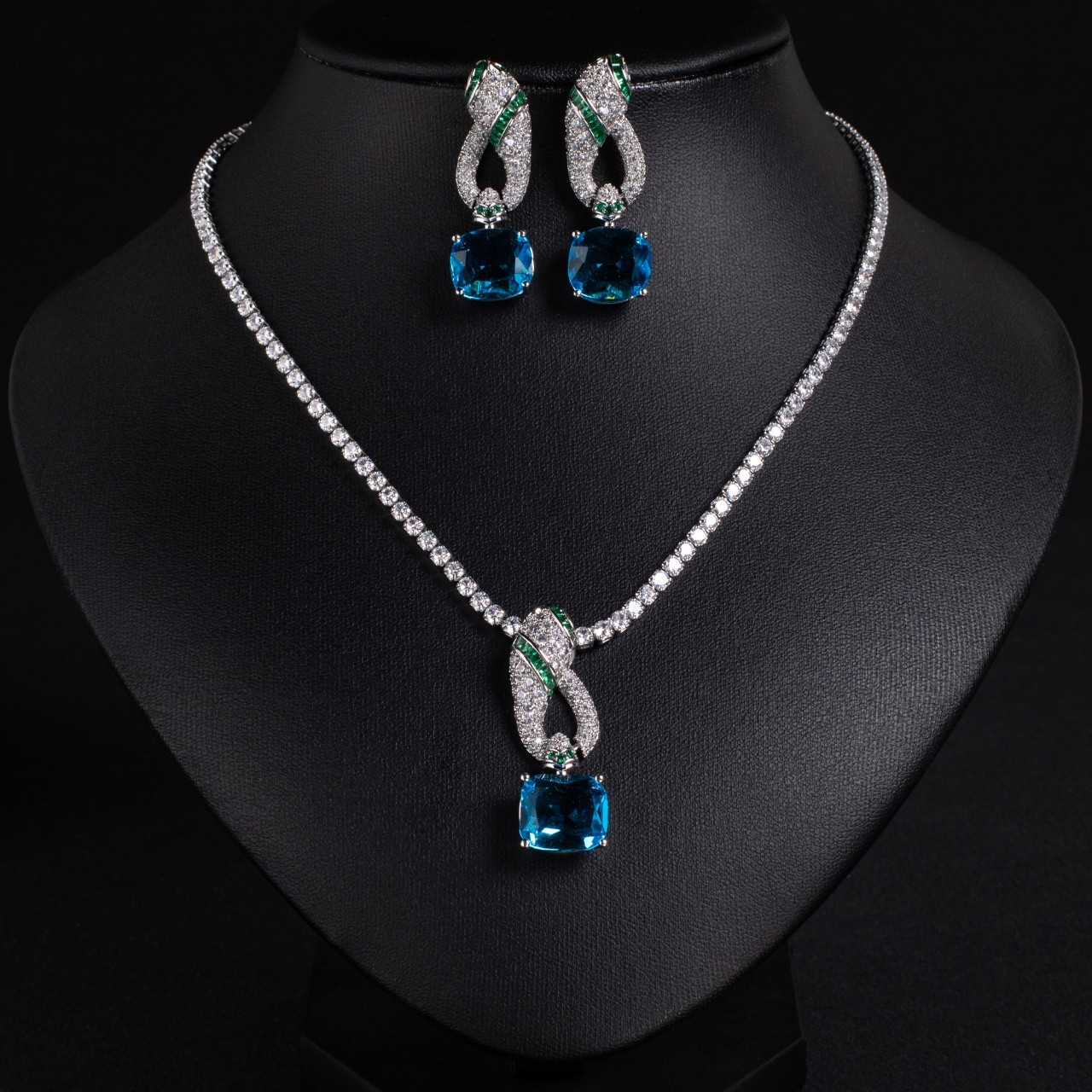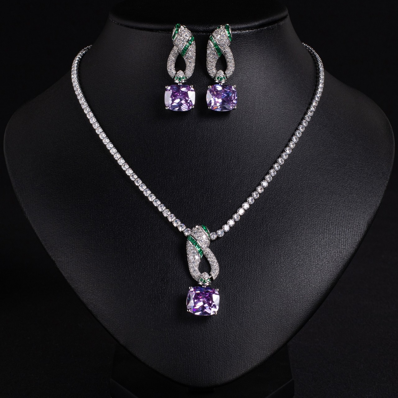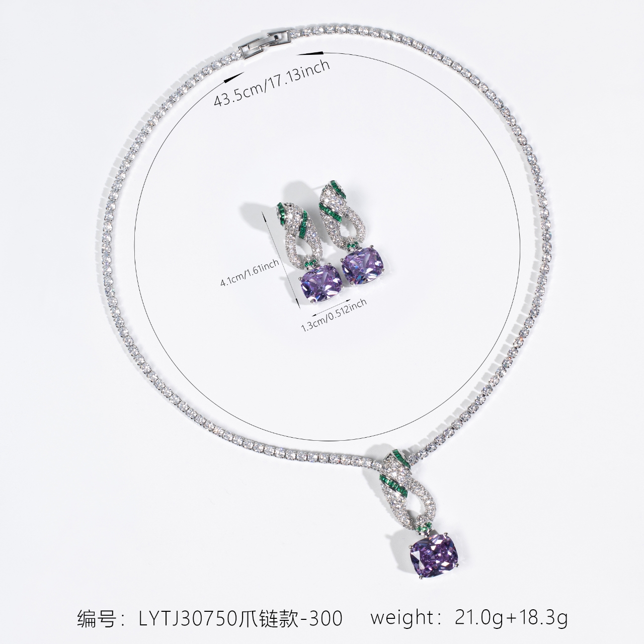 This copper plated with 18k gold vintage wrap zircon jewelry set features multi color zircon stones in blue white and purple creating a light luxury banquet style niche gemstone set.