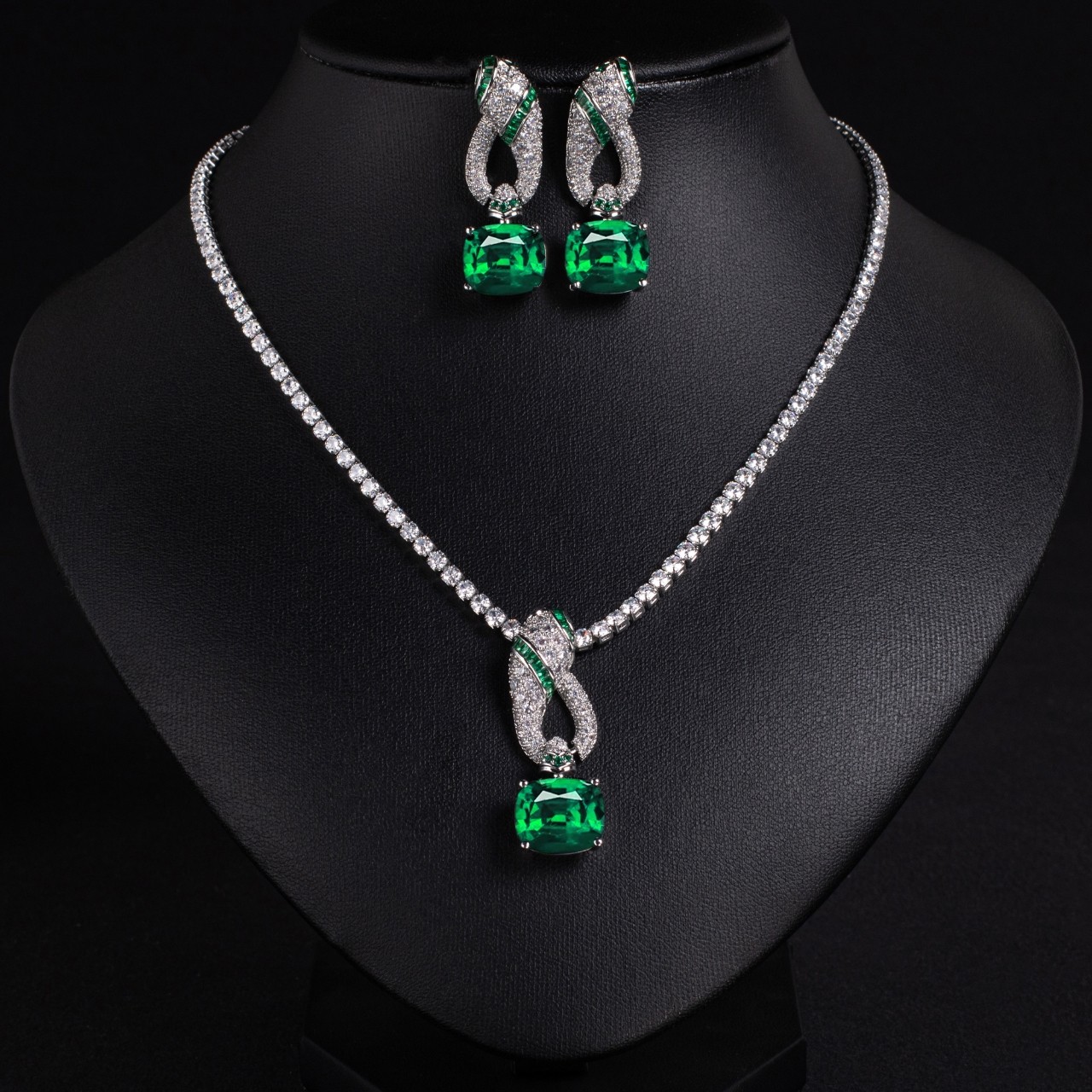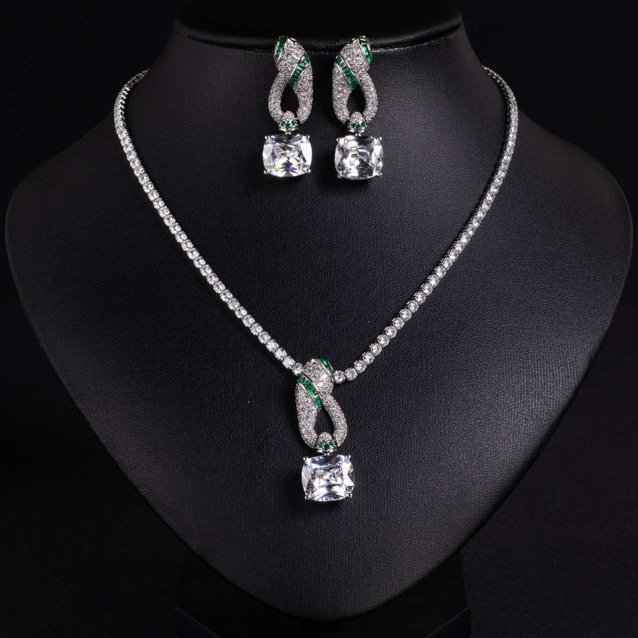 The 18k gold plated brass square cubic zirconia necklace and earring set with twist design is ideal for bridal jewelry sets and trendy formal event accessories.