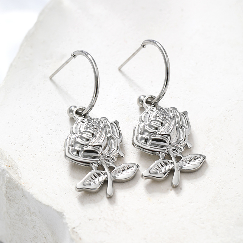 Vintage Rose Stainless Steel Drop Earrings Silver by Lonceen
