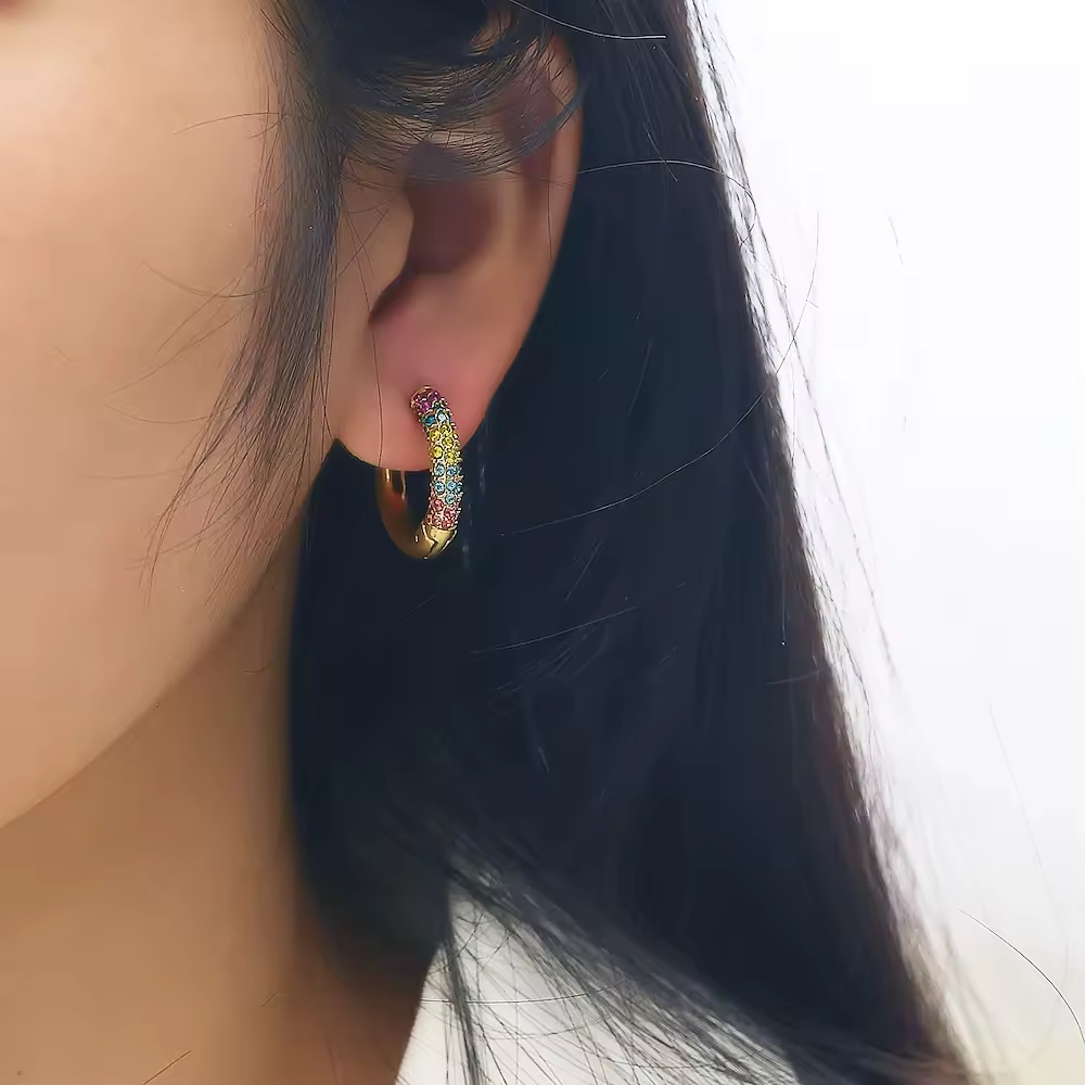 This Lonceen stainless steel earring set showcases 18K-plated square hoops adorned with rainbow crystals—blending bold geometric silhouettes with vibrant accents, tailored for eye-catching fashion styling.