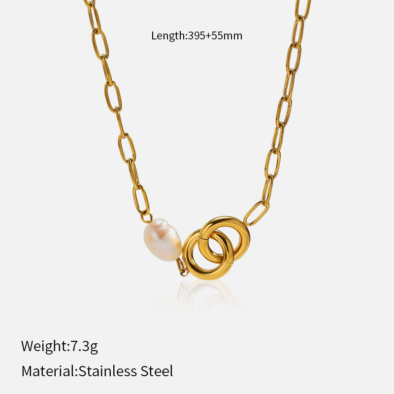 This stainless steel necklace with pearl features a gold-tone chain, a natural pearl accent, and a refined double ring design. The minimalist style makes it suitable for daily wear, gifting, or fashion retail collections.