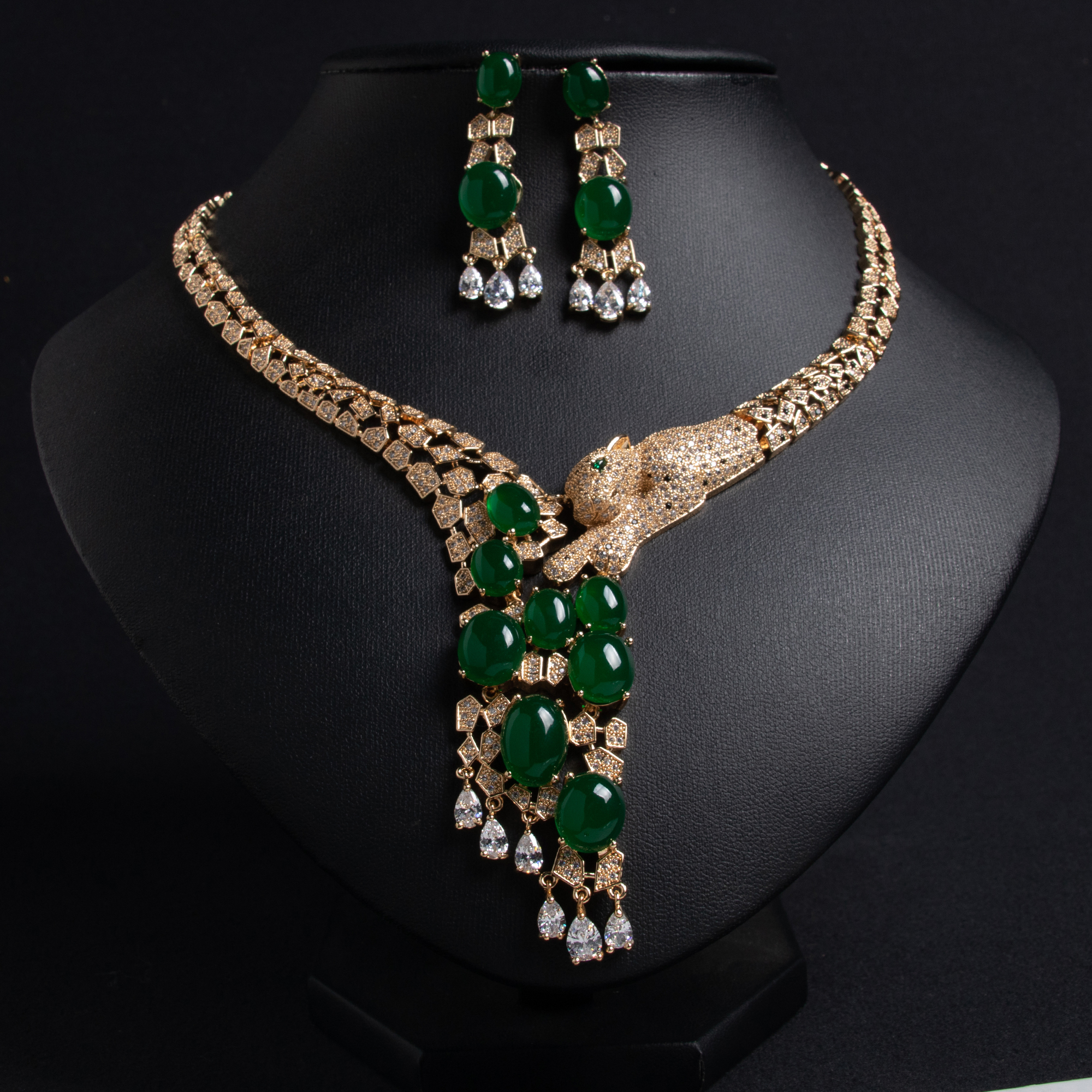 Свадебный комплект каскадных украшений с камнями Пантера из 18-каратного золота