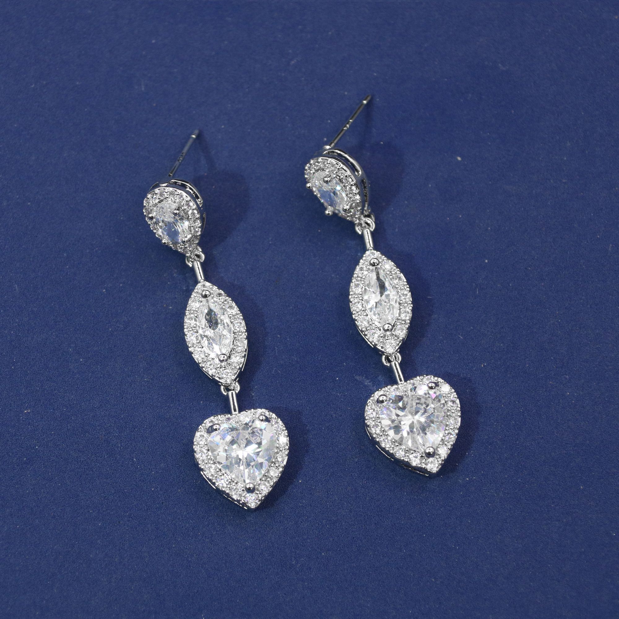 这些多层泪滴形和心形吊坠耳环由 Lonceen 制作,采用透明立方氧化锆镶嵌在 18k 镀金黄铜中。分层设计增添了深度和光彩,使其成为欣赏精致优雅的女性的理想耳环。